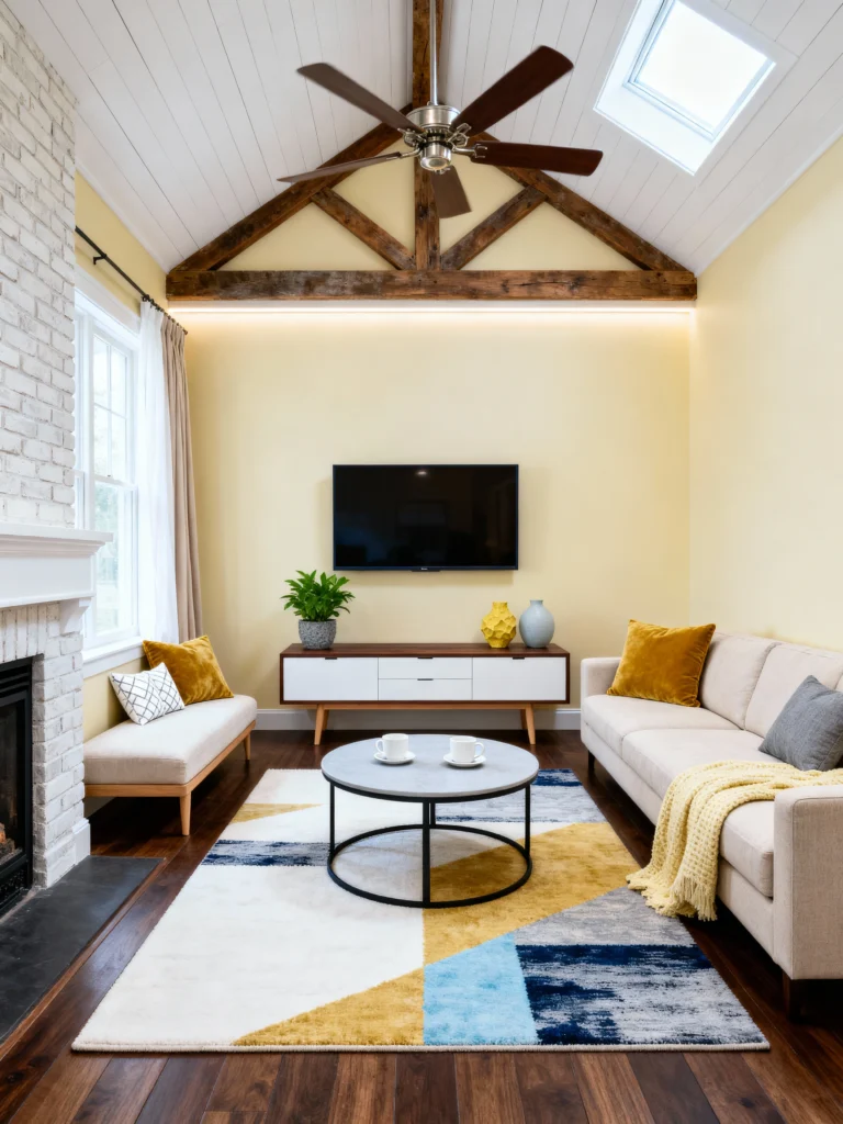Start with a high vaulted ceiling and accent it with rich, dark wooden beams to draw the eye upward. Paint the walls a soft, sunny yellow to keep things bright and cheerful. Choose a sleek, low-profile media console in white and wood tones to mix eras. Anchor the space with a large geometric rug featuring pops of blue and gold. Add a simple concrete-style round coffee table for balance. Don’t forget a ceiling fan to circulate air and keep the vibe breezy.