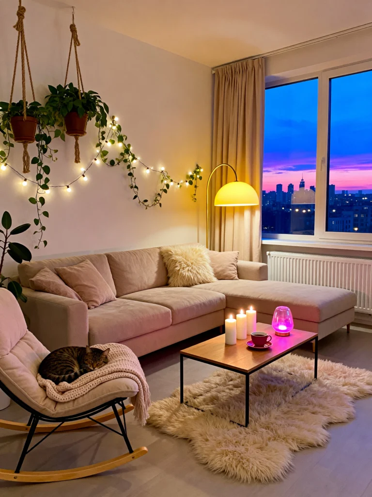 Create a cozy sanctuary perfect for evening relaxation. Drape string lights along the wall in a swag pattern and mix them with hanging trailing plants. Choose a large, plush beige sectional for lounging. Place a rocking chair nearby with a chunky knit pink throw for texture. Use a simple wood and metal coffee table for candles and your evening tea. Let the city view be your main art piece, framed by soft beige curtains that pool on the floor.