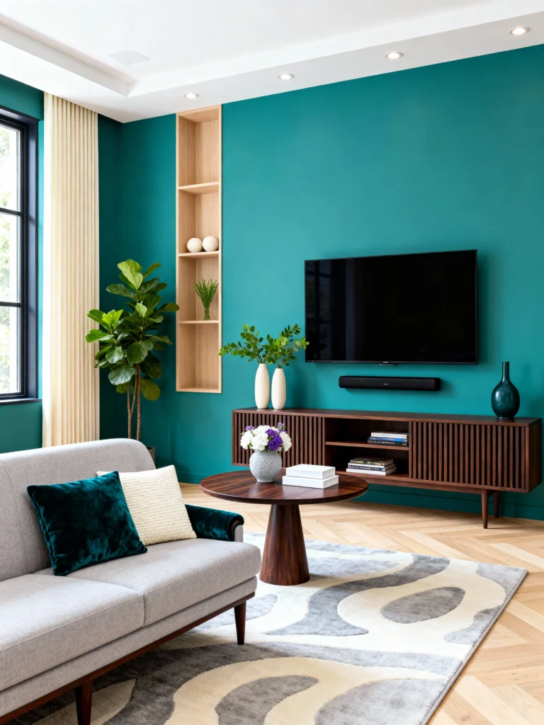 Make a statement with a saturated teal accent wall that defines the room. Furnish with a sleek, mid-century modern credenza in dark walnut wood with slat details. Choose a light grey sofa with tapered legs to keep the floor area looking open. Add a sculptural, dark wood pedestal coffee table. Place a large, patterned rug with abstract grey waves to add movement. Decorate with white ceramic vases and simple greenery to maintain the sleek, vintage-inspired aesthetic.