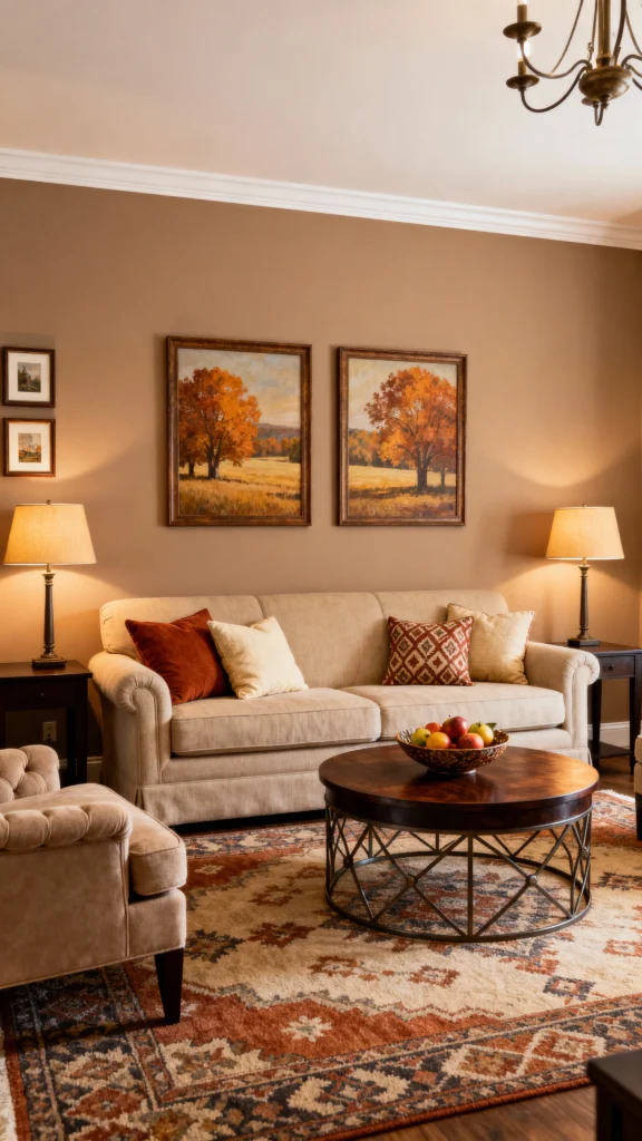 Artwork is an easy way to brighten up your living room while using warm browns and earth tones. Choose pieces that reflect nature, like landscapes or abstract forms, to pull the cozy vibe together. Hang them in a group to create a focal point that invites conversation and adds warmth to the space.