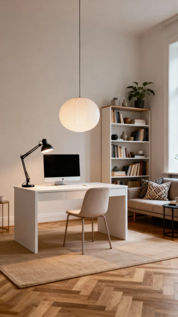 Lighting can make a big difference in a minimalist home office. Simple fixtures like pendant lights or sleek desk lamps create a warm and inviting atmosphere. Pairing natural light with soft artificial lighting ensures your workspace feels bright without being cluttered.