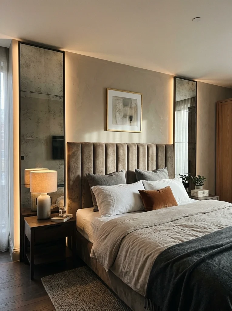 When used thoughtfully, mirrors are a hotel-style bedroom design staple. Instead of a solid mirrored wall (which feels very 1980s), use tall, tinted, or antiqued mirror strips on either side of a fabric headboard.