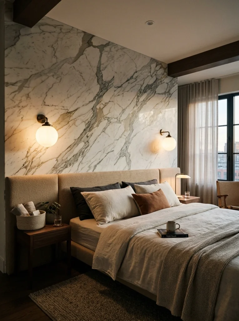 If you’re dealing with a large master suite and have the budget for a premium hotel-style installation, a marble feature wall is unmatched. Large-format porcelain slabs mimic the look of natural stone without the insane weight.