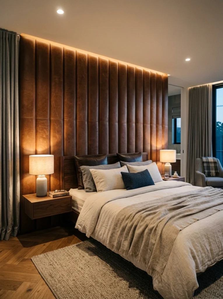 Nothing says “executive suite” quite like a massive, channel-tufted leather wall. It brings warmth, a subtle scent, and an undeniably masculine edge to luxury headboard wall inspiration.