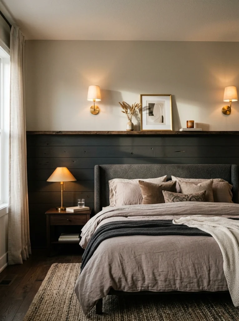 This is arguably the most practical and budget-friendly setup for a tight space. Installing wood paneling (like shiplap or wainscoting) only halfway up the wall naturally creates a shallow ledge right behind the bed.