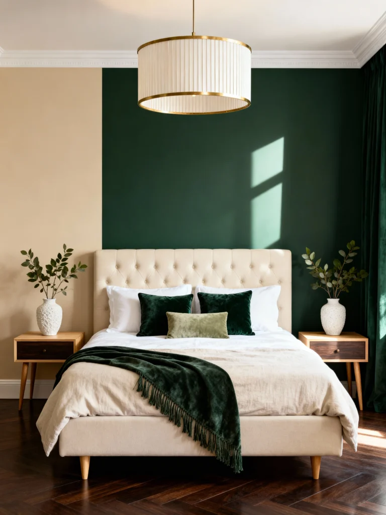 I love this two-tone wall look! The deep forest green accent is so calming and pairs beautifully with the earthy beige on the side wall. It instantly gives the room a refined, nature-inspired feel. The upholstered bed and rich green velvet pillows really amp up the luxurious texture.