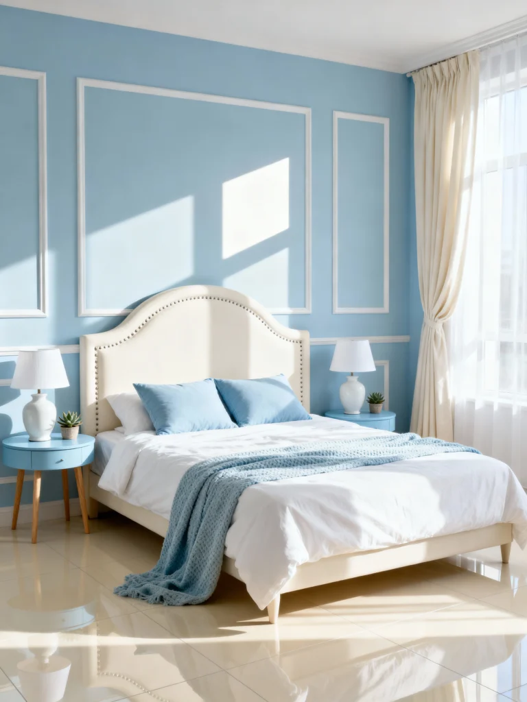 ow utterly peaceful is this? The soft, powdery sky blue on the walls is incredibly tranquil. The white paneling and wainscoting add a beautiful, classic detail. Paired with the cream bed and light blue accents, it feels like sleeping on a cloud. The shiny floor reflects the natural light beautifully.