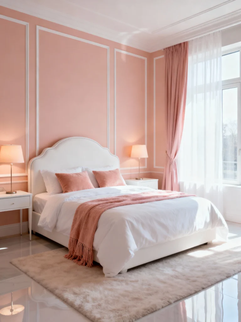 This bedroom is pure soft romance! The walls are a beautiful, light peach or blush pink, which is so calming and warm. The white moulding detail on the walls adds a touch of classic elegance. Paired with white bedding and a soft, chunky blush throw, it’s a total princess moment.