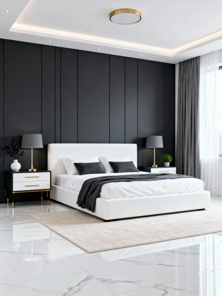 This is the ultimate in sleek, modern sophistication. The deep charcoal-gray panelled accent wall creates a striking, dramatic backdrop for the crisp white bedding. The use of black, white, and gray is timeless, and the metallic gold accents on the light fixture and nightstand add a touch of luxury.