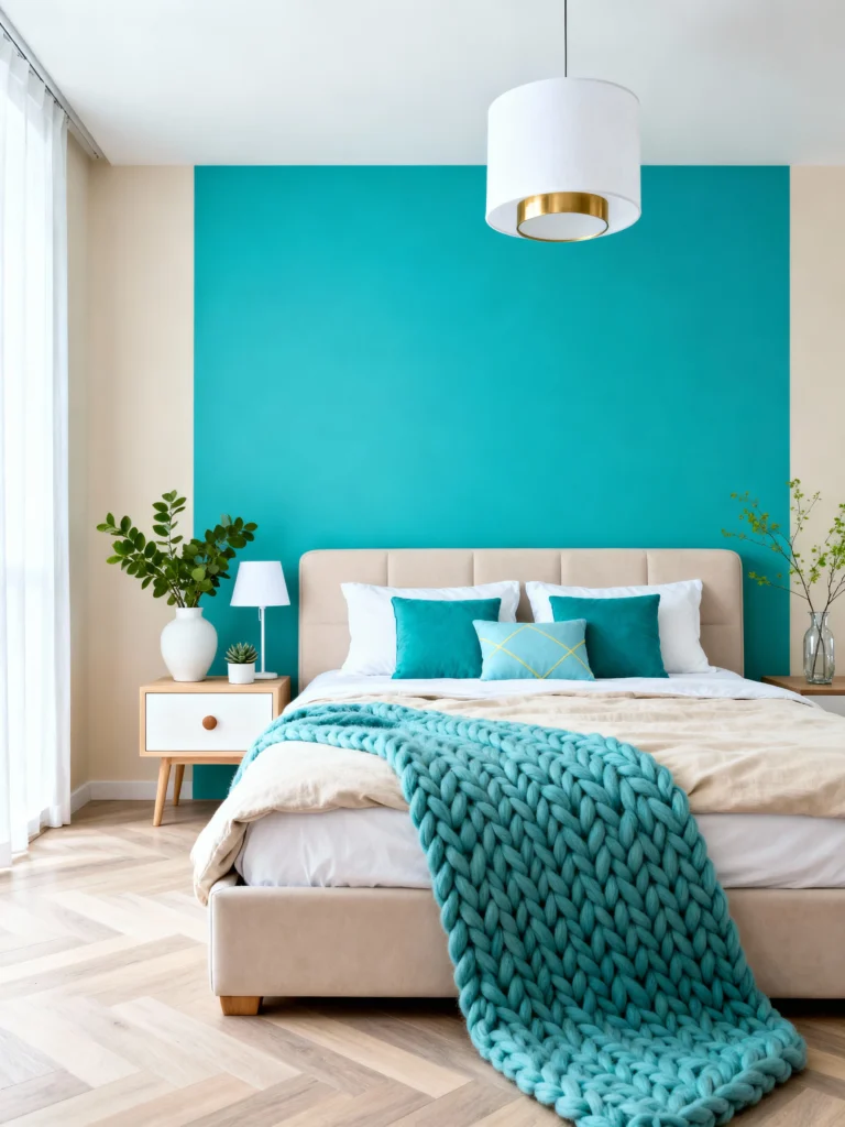 • Contrast with neutrals: Pair the bold wall with a neutral-colored bed and natural wood accents.