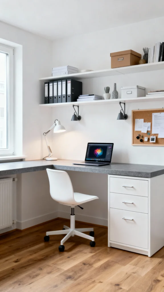 When space is tight, smart storage becomes a priority. Floating shelves are a quick way to free up desk space while keeping your essentials within reach. Don’t forget about stylish boxes and organizers; they can add a pop of design while hiding away clutter.