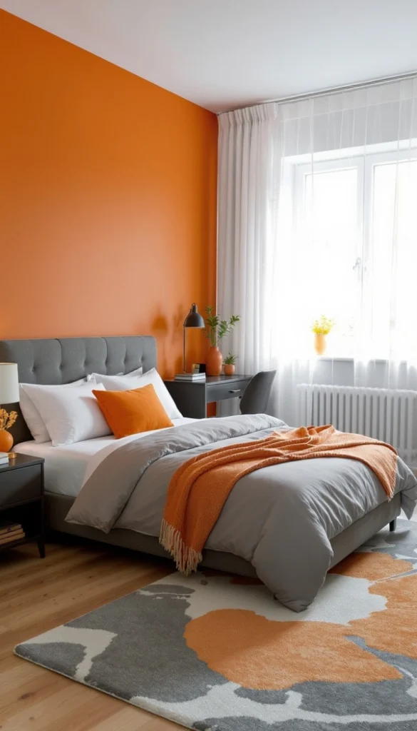 This room is all about making a vibrant statement! The bold, orange accent wall immediately catches your eye and brings so much warmth and energy. Pairing it with cool gray bedding and a modern, tufted headboard keeps the whole look grounded and sophisticated, not overwhelming. The white window sheers let in tons of light, making that orange pop. It’s modern, cheerful, and perfectly balanced.