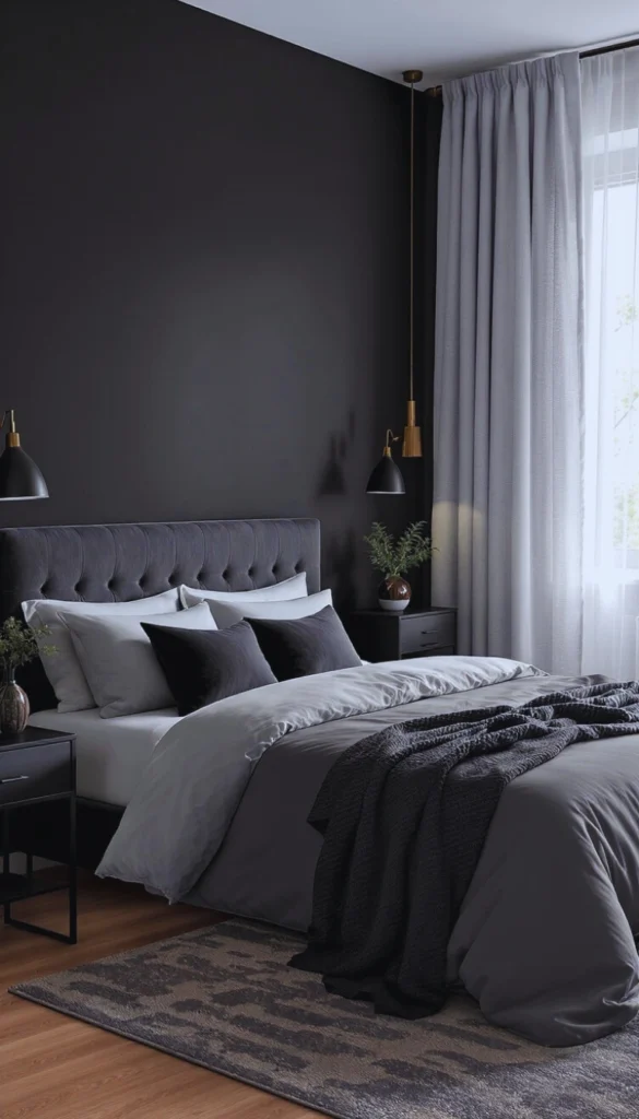 • Go dark: Choose a deep, moody color like charcoal or black for the wall behind your bed—it instantly adds depth and drama.