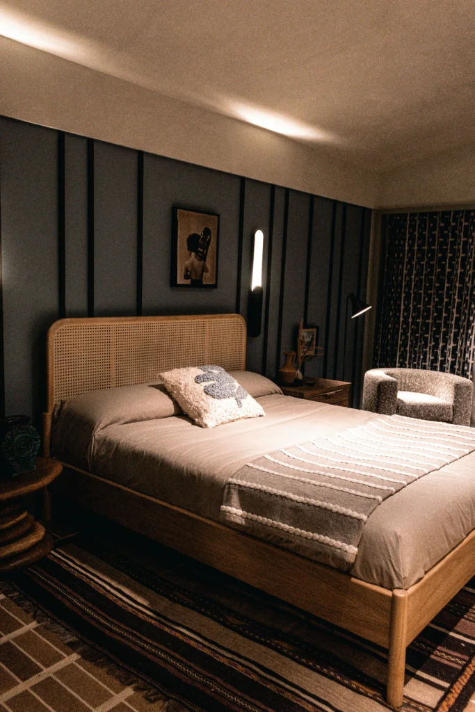 This room has a wonderful, eclectic blend of Mid-Century Modern and Southwestern vibes. The cane headboard is a classic vintage touch, and the warm, earthy colors in the rug and throw blanket are so inviting. The vertical shiplap in a deep gray creates fantastic visual interest without being distracting. It feels curated, cozy, and full of personality!