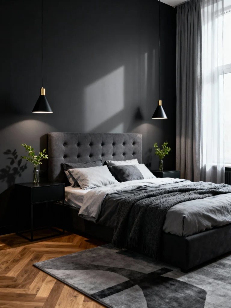 - Go dark: Choose a deep, moody color like charcoal or black for the wall behind your bed—it instantly adds depth and drama.