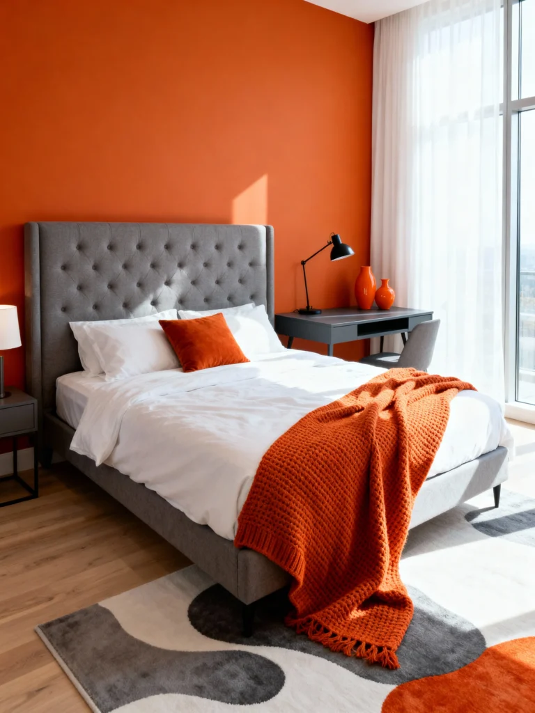 This room is all about making a vibrant statement! The bold, orange accent wall immediately catches your eye and brings so much warmth and energy. Pairing it with cool gray bedding and a modern, tufted headboard keeps the whole look grounded and sophisticated, not overwhelming. The white window sheers let in tons of light, making that orange pop. It’s modern, cheerful, and perfectly balanced.