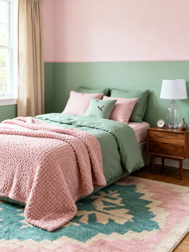 Textiles are key to creating a cozy vibe in your pink, green, and beige bedroom. Soft blankets and fluffy pillows not only add comfort but also bring together the pastel colors beautifully. Mixing fabrics like cotton and fleece can create a charming aesthetic that makes you want to relax and unwind.