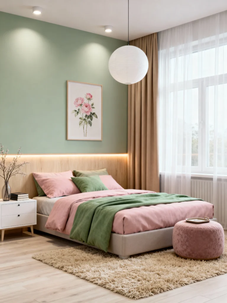 An accent wall in a soft pastel shade can really transform a bedroom. Pairing pink, green, and beige creates a cozy and inviting atmosphere. This look is all about mixing colors to bring charm and warmth into your space.