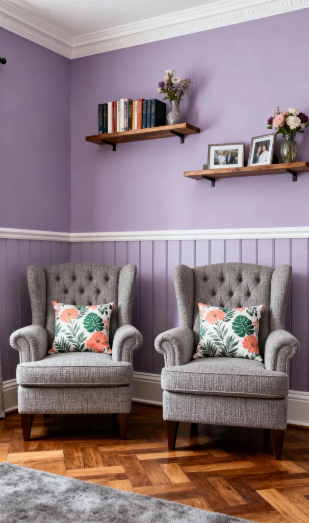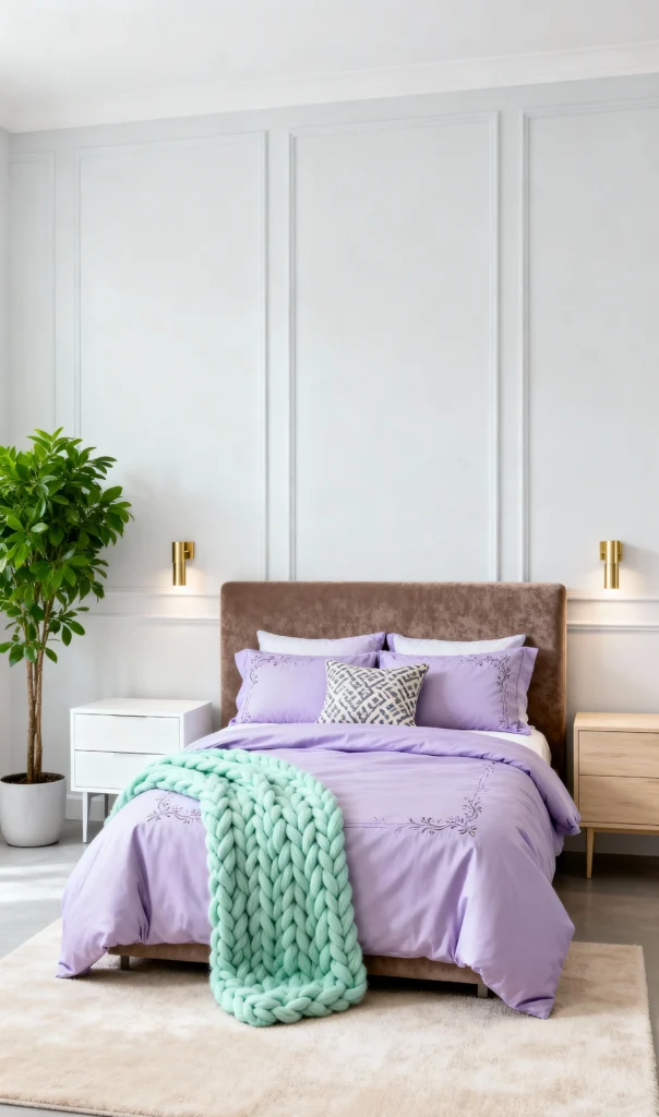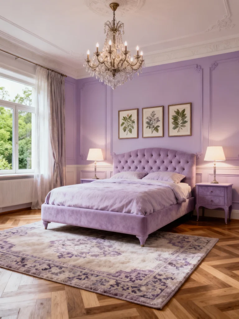 This lavender bedroom is a lovely blend of calm and comfort. The soft purple walls create a soothing atmosphere, while the gold and grey accents add a touch of elegance. With natural light streaming in, this space feels airy and inviting, making it a perfect retreat for relaxation.