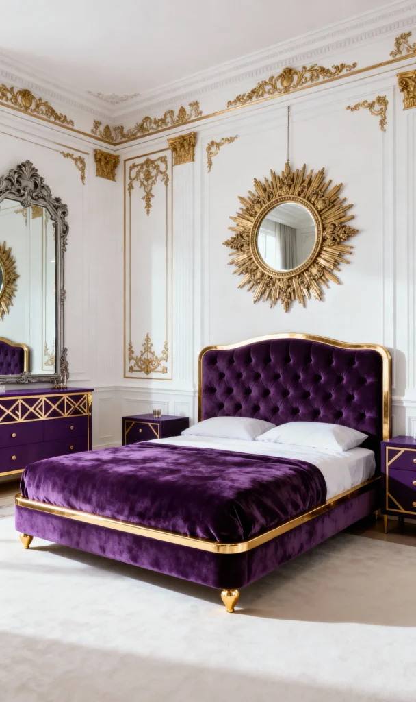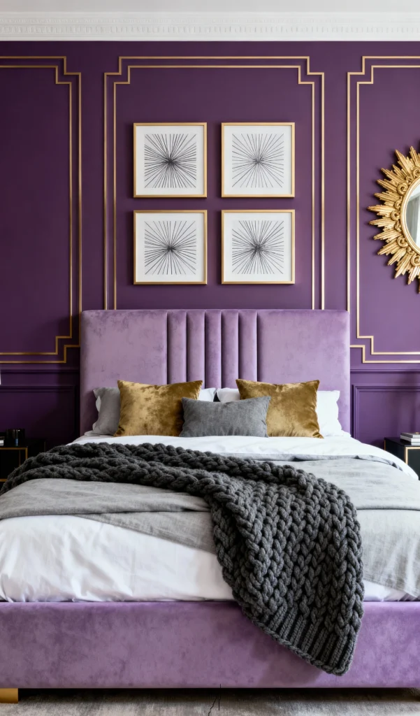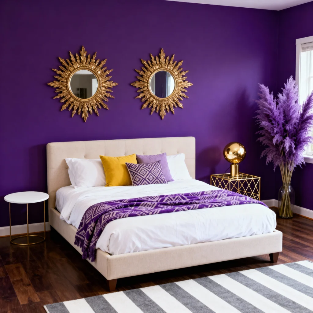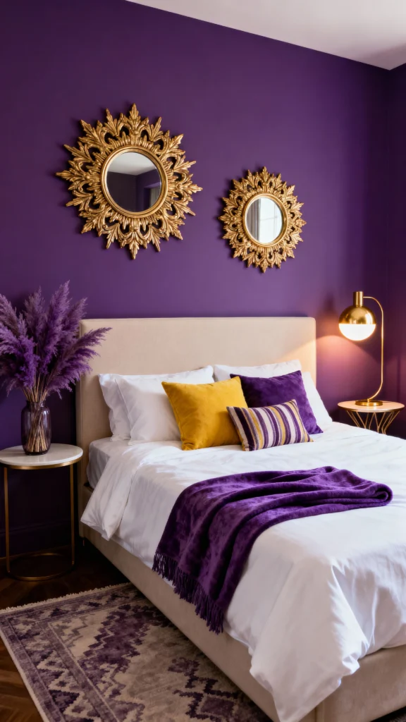 Gold wall mirrors are a fun way to add personality to your bedroom. These mirrors not only reflect light but also create a focal point that ties the room together. Pair them with your purple walls for an eye-catching contrast that feels both stylish and inviting.