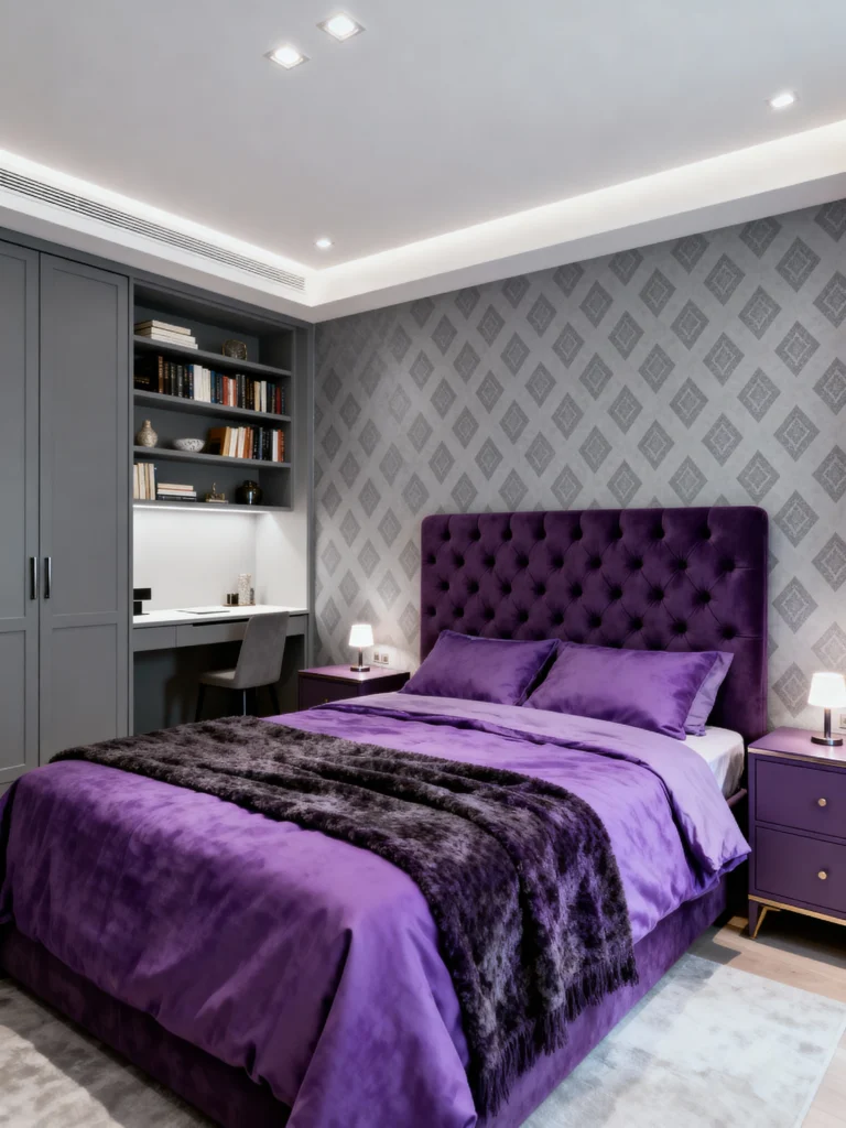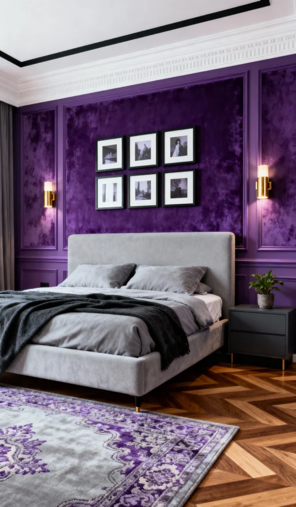 A chic grey accent wall can transform your bedroom into a cozy retreat. Pairing it with rich purple bedding adds a touch of elegance and warmth. This combination invites relaxation while keeping the space stylish and inviting.