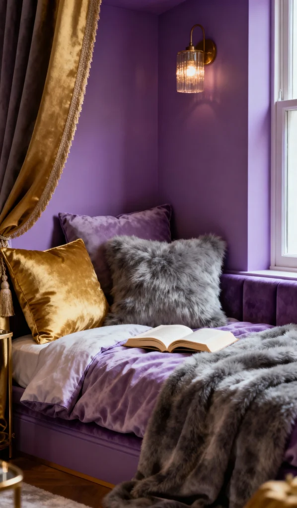 This purple reading nook is all about comfort and style. The soft bedding and plush pillows invite you to curl up with a good book. With gold and grey accents, it feels both cozy and elegant, making it a perfect spot for relaxation.