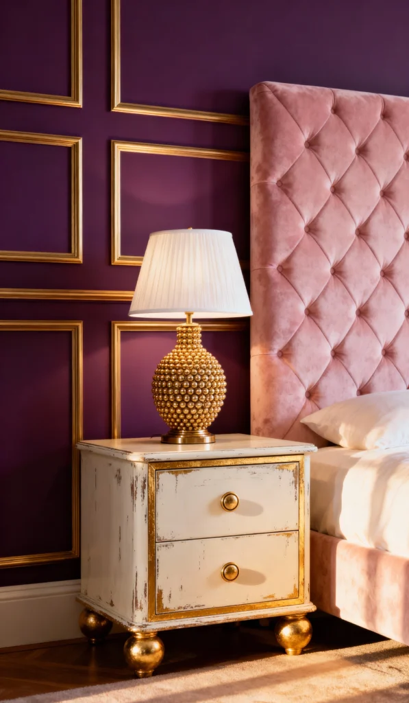 Gold bedside lamps can instantly elevate your bedroom’s vibe. They add a touch of warmth and elegance against a bold purple wall, creating a cozy atmosphere. Pairing them with soft textiles enhances the inviting feel, making your space feel like a relaxing retreat.