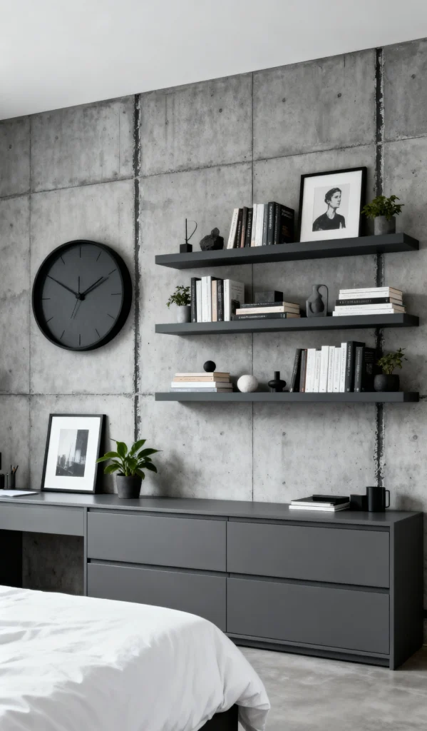 Grey wall shelves are a stylish addition to any bedroom. They offer a clean, modern look while providing practical storage and display space. Pairing them with gold and purple accents can really elevate the overall vibe of your room.