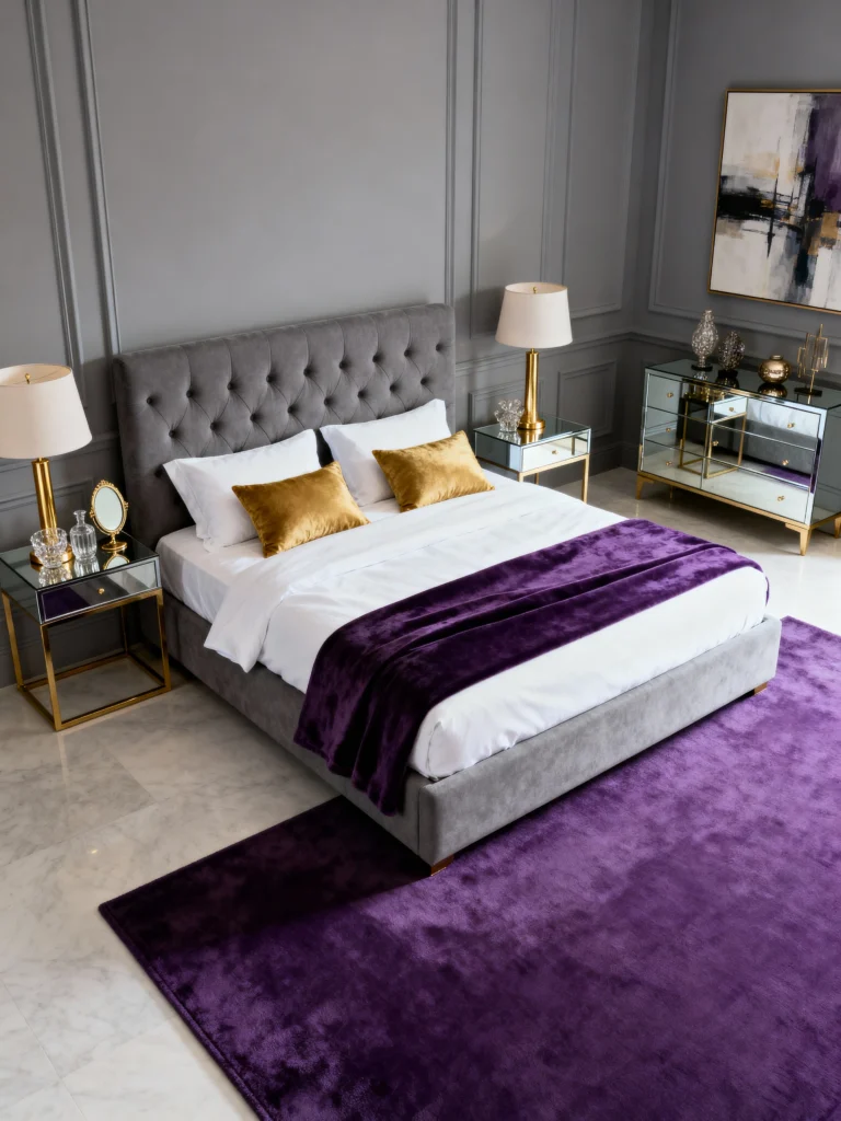 A plush purple area rug can add a delightful touch to your bedroom. Its rich color brings warmth and a sense of comfort to the space. Pair it with gold and grey accents for a chic, coordinated look that feels inviting.