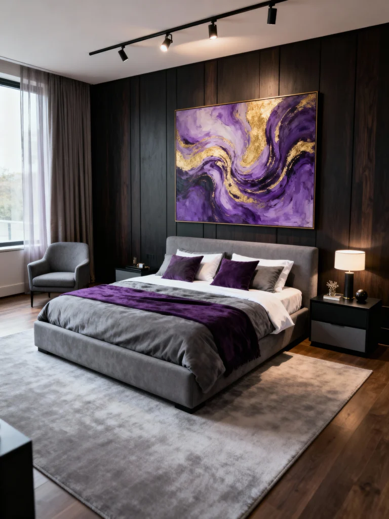 Adding purple wall art to your bedroom can really elevate the space. The blend of purple hues in the artwork complements grey and gold accents perfectly. It’s a simple way to bring a touch of elegance and personality to your room.