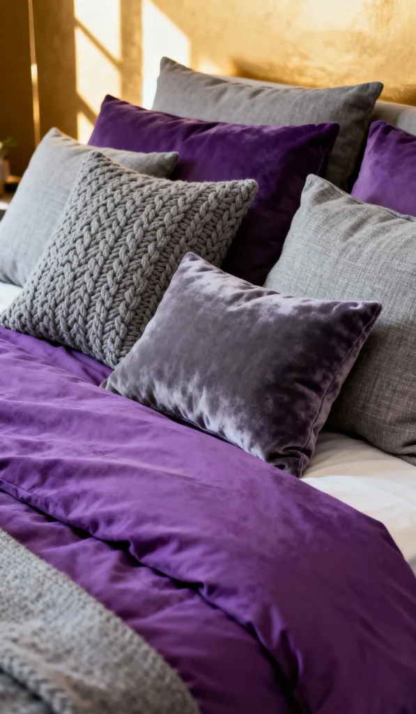 Grey throw pillows can easily elevate the look of your bedroom. They add a soft touch while perfectly balancing out bold colors like purple. Mix and match different textures for an inviting and cozy feel!