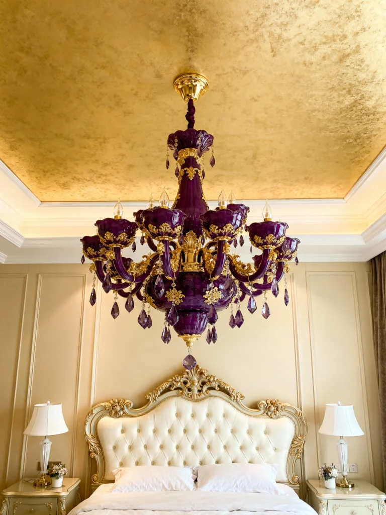 A whimsical purple chandelier can be a delightful focal point in any bedroom. The vibrant hue adds a playful touch while the gold accents provide a touch of elegance. This combination brings a sense of charm and warmth, making your space feel inviting and unique.