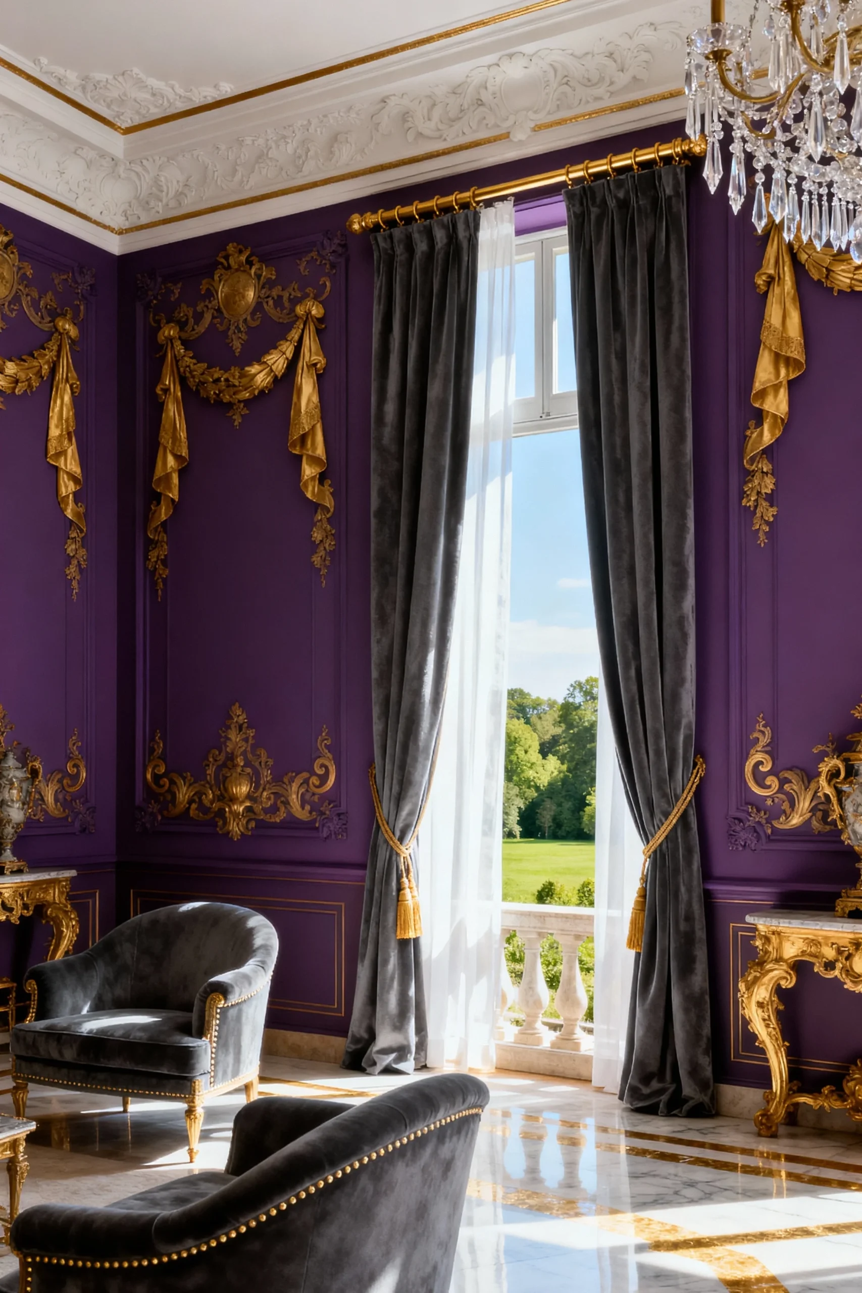 Light fixtures can really tie a room together, especially when they come in grey. They add a touch of elegance and modernity to any space, complementing the rich purple tones beautifully. Plus, the mix of grey and gold accents can create a cozy and inviting atmosphere.