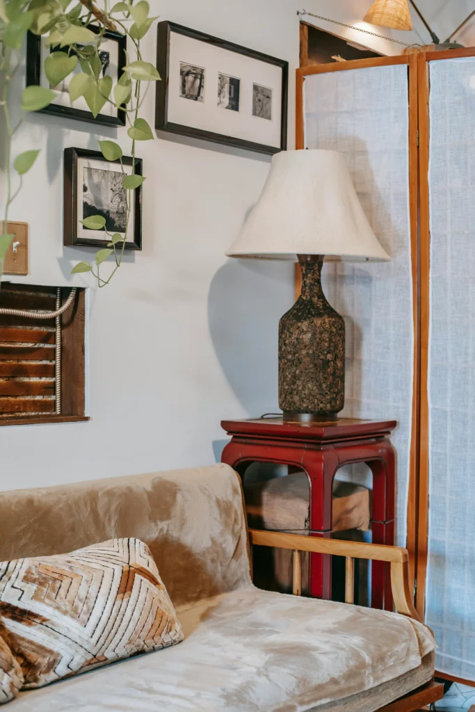 This nook is full of character! Snuggle up on a velvet chaise lounge or a small, plush sofa in a soft, neutral tone. Place a deep red, carved side table next to the seating for a bold pop of color and an exotic feel. Top it with a unique, textured base lamp and a classic shade—it instantly draws the eye. Frame and hang some small, black-and-white photos to personalize the wall. Don’t forget a trailing houseplant for a touch of life and a breezy, linen folding screen to partition the space for extra privacy.