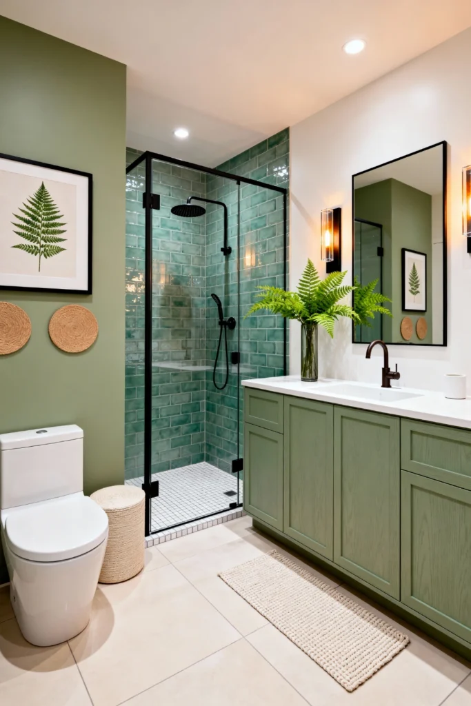 Choose a muted, sage green vanity to anchor your space with natural warmth. Pair it with a shower framed in black glass and filled with glossy, emerald subway tiles to create a stunning focal point. Opt for matte black fixtures, like the showerhead and faucet, to add a modern, grounded touch. Place simple woven baskets and soft beige floor mats around to keep the earthy vibe going. Hang simple botanical fern prints in black frames on a green accent wall to complete this fresh, nature-inspired retreat.