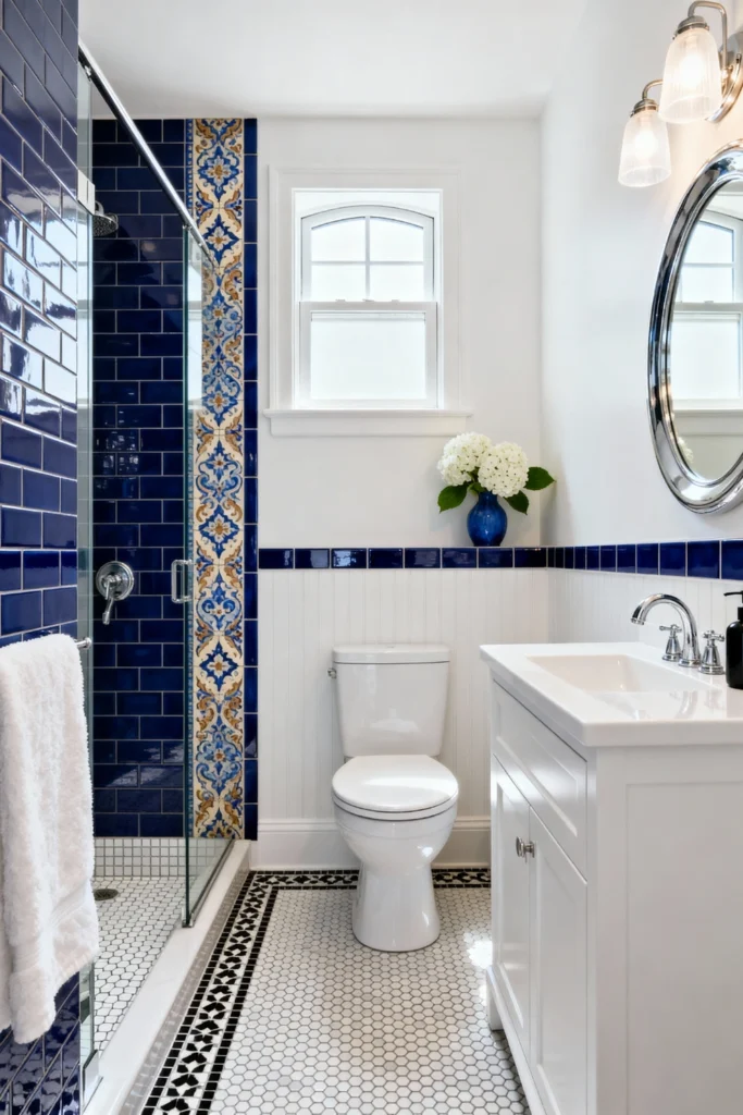 Go for bold, glossy cobalt blue subway tiles in your shower to make a serious splash. Add a striking, decorative vertical tile border featuring blue and gold motifs to break up the solid color. Opt for crisp white beadboard wainscoting on the lower half of your walls to keep the space feeling bright and traditional. Use a classic white vanity with polished chrome hardware for a timeless look. Lay down black and white hexagonal floor tiles with a custom border to tie the whole elegant, vintage-inspired room together.