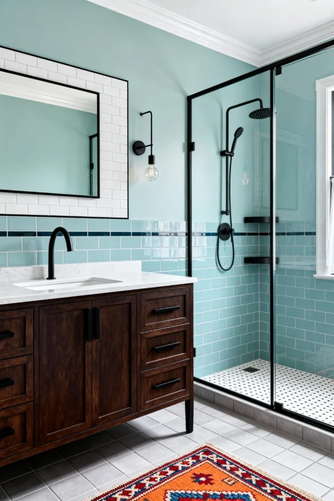 Paint the upper half of your walls in a refreshing, soft mint green to brighten the room instantly. Choose a rich, dark walnut vanity with plenty of drawers to ground the airy space. Use glossy, aqua-blue subway tiles in the shower with a bold, dark teal accent stripe running horizontally. Frame your shower with striking black grid glass doors. Lay down a vibrant, multicolored kilim rug in shades of orange and blue over a simple grey tiled floor to add an unexpected, bohemian flair.
