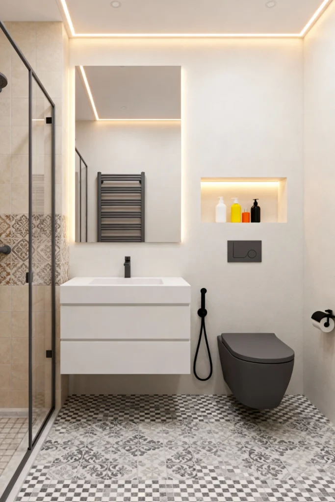 Select a sleek, matte black wall-hung toilet to instantly elevate the modern feel of your space. Hang a large, rectangular frameless mirror with warm backlighting to create a soft, cinematic glow. Opt for a crisp, white floating vanity with handleless drawers for an ultra-minimalist look. Use a gorgeous grey and white patterned cement tile for the floor to add a subtle layer of texture and visual interest. Carve out a built-in illuminated wall niche to display your colorful bath products like little pieces of art.