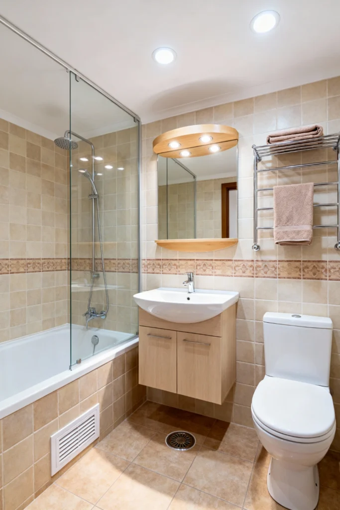 Wrap your bathroom in warm, sandy beige square tiles from floor to ceiling for a cohesive, soothing atmosphere. Choose a light oak floating vanity to keep the floor space open and airy. Opt for a uniquely shaped mirror with an integrated arched wooden light fixture to add a soft, organic feel. Install a sleek, frameless glass bath screen to maintain an open visual flow. Hang a polished chrome heated towel rack nearby and drape soft, mocha-colored towels over it to enhance the cozy, spa-like experience.