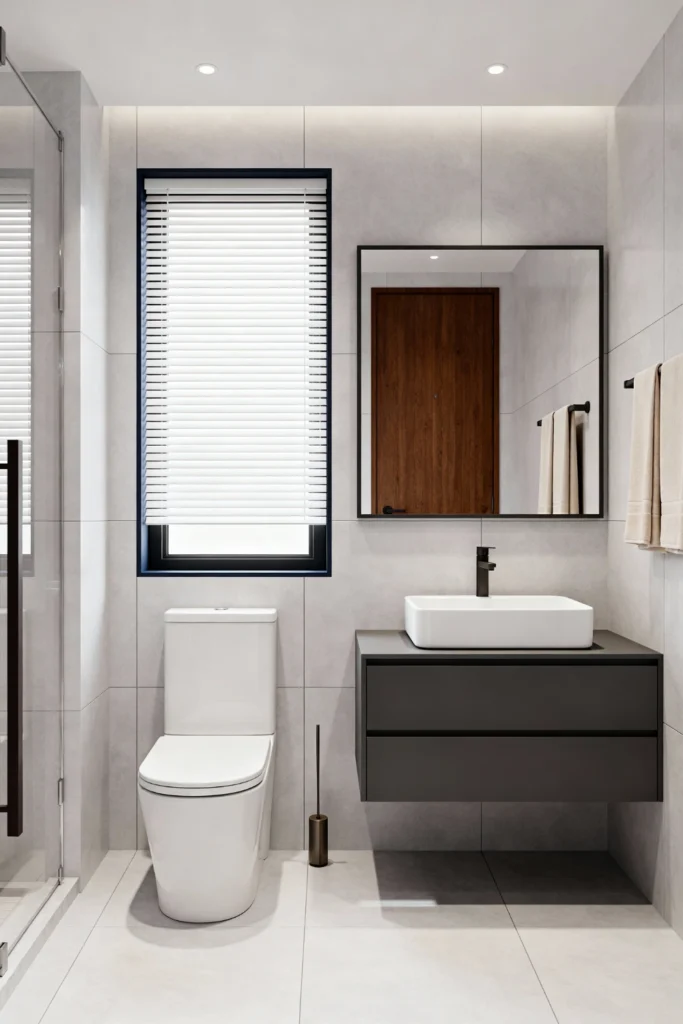 Cover your walls in oversized, soft grey stone-look tiles to create a seamless, sophisticated backdrop. Choose a charcoal grey, floating double-drawer vanity topped with a crisp white vessel sink. Opt for a striking, black-framed mirror that perfectly matches the dark trim of your window. Use matte black fixtures, including the faucet, towel rack, and toilet brush, to provide sharp, contemporary contrast. Hang simple, sand-colored towels to soften the strong, geometric lines of this beautifully minimalist space.