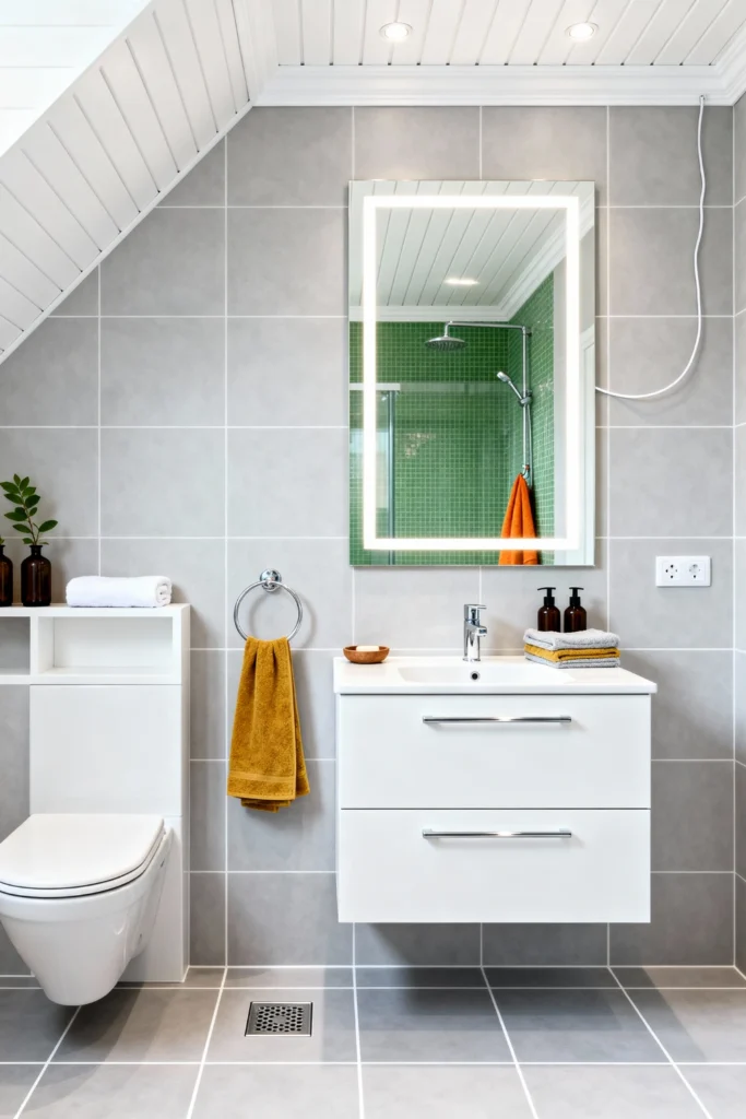 Embrace your home’s unique architecture by painting a sloped ceiling with fresh, white beadboard. Choose soft grey square wall tiles to create a calm, neutral canvas. Add a surprising pop of color with vibrant green mosaic tiles inside the shower stall. Opt for an integrated LED-backlit mirror to provide perfect, shadow-free lighting over your sink. Place a sleek white floating vanity with chrome drawer pulls beneath it. Hang a mustard yellow hand towel on a simple silver ring to introduce a warm, cheerful accent color.