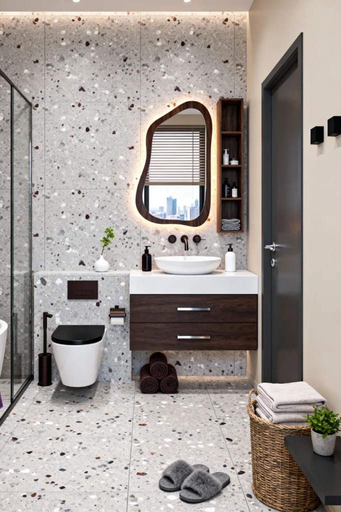 Cover both your walls and floors in playful, large-flake terrazzo tiles to create a highly textured, trendy look. Hang a uniquely shaped, organic wavy mirror with warm backlighting to soften the room’s straight lines. Choose a dark wood floating vanity topped with a thick, pure white counter and a simple vessel sink. Opt for a bold, matte black wall-mounted toilet and a matching black toilet paper holder. Add a cozy touch by leaving a pair of fluffy grey slippers right on the cool stone floor.