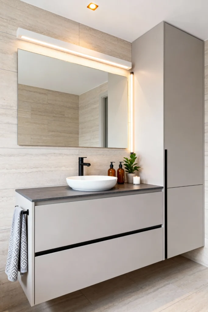Wrap your walls in horizontal, travertine-style beige tiles to create a luxurious, hotel-like atmosphere. Choose a sleek, soft-taupe floating vanity and pair it with a matching tall storage cabinet. Hang an extra-wide frameless mirror and install a long, linear LED light bar right above it for flawless illumination. Opt for a rounded white vessel sink paired with a matte black wall-mounted faucet for a touch of drama. Place amber glass soap dispensers and a tiny potted green plant on the dark countertop for an earthy finish.