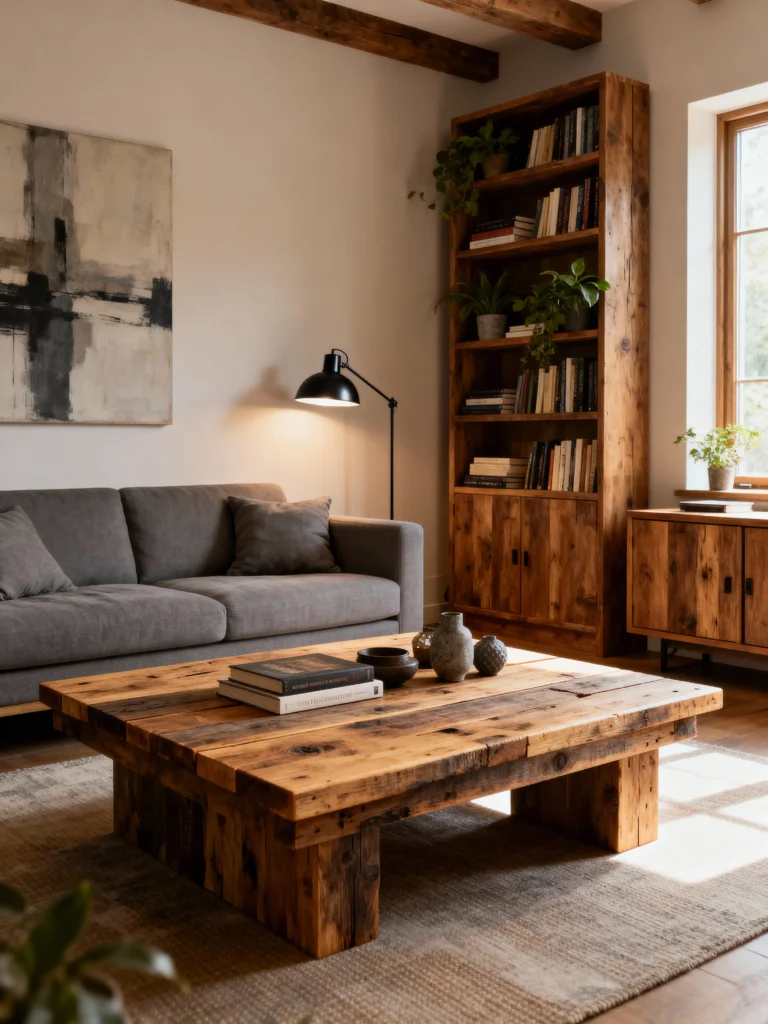 - Wooden Furniture: A reclaimed wood coffee table or a rustic bookshelf.