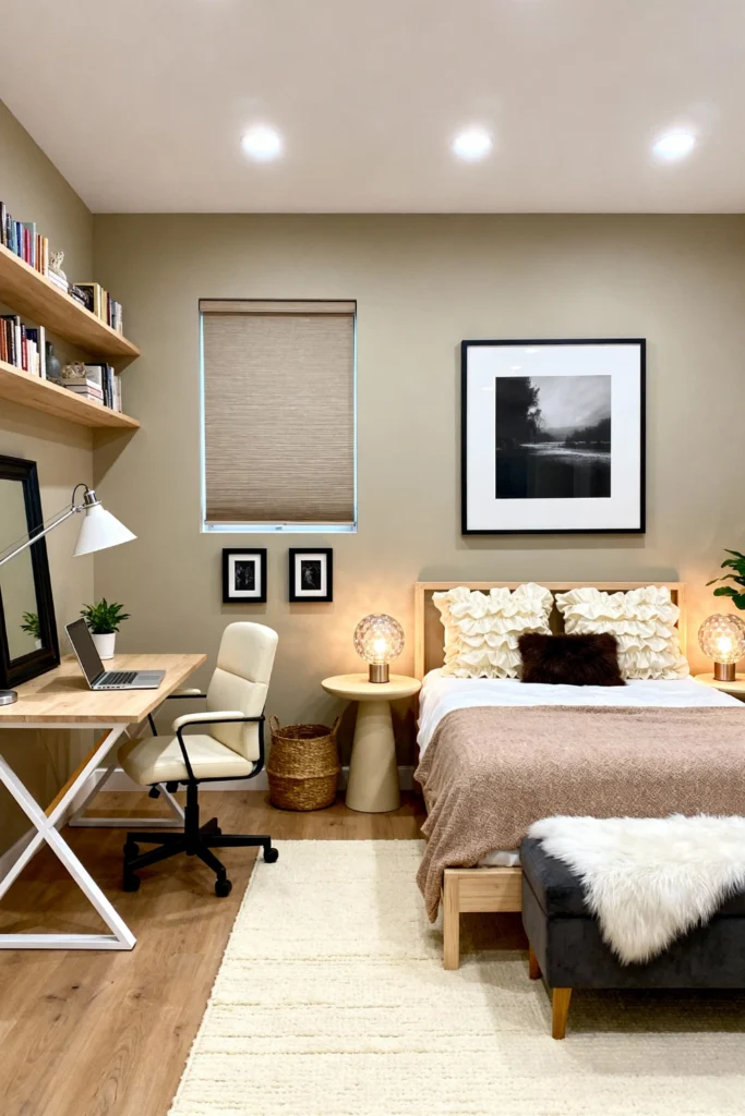 Make your workspace part of your sanctuary. Paint the walls a calming sage or taupe and install floating wooden bookshelves to keep the floor clear. A simple white X-frame desk with a light wood top keeps things feeling light. For the bed, use ruffed cream shams and a cocoa-colored coverlet. Small touches, like globe-style bedside lamps and a faux-fur bench at the foot of the bed, make this multi-purpose room feel cohesive and expensive.