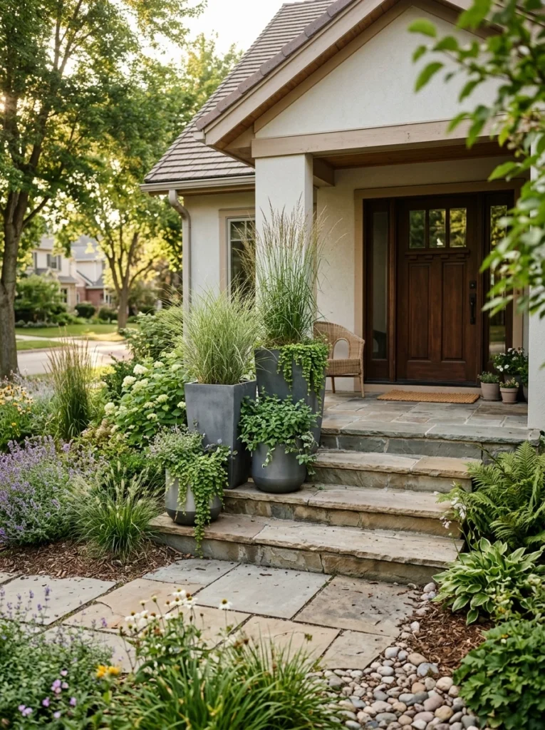 Soften a straight, rigid entry with a gently curving stone pathway, lined tightly with overflowing flower borders and native pollinator plants. Why it works: Curves make a small space feel much deeper. It leads the eye on a journey rather than a straight rush to the door. Best home style: Craftsman, Cottage, or historic Bungalows. Styling tips: Layer your heights! Keep low ground covers right against the path, and mid-sized perennials behind them. Add warm brass path lighting for evening charm.