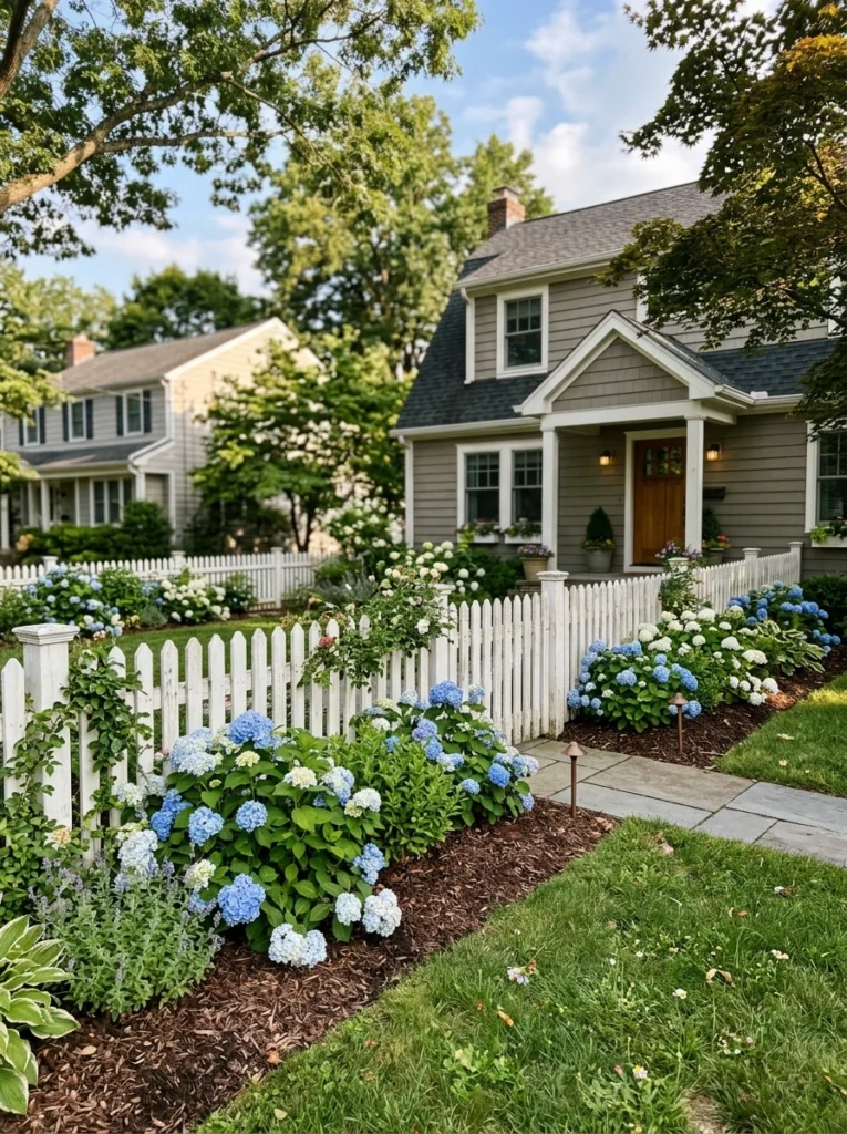 Plant a continuous row of blooming shrubs—like compact hydrangeas or azaleas—directly in front of a low picket or iron fence. Why it works: It visually connects your boundary line to the house, softening hard architectural lines with lush, repeating textures. Best home style: Coastal, Cape Cod, or traditional Farmhouse. Styling tips: Ensure your soil acidity is right if you want specific hydrangea colors. Add a neat layer of dark mulch beneath to make the green foliage pop.