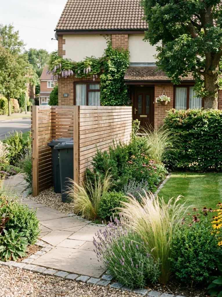 Construct a beautiful slatted wood screen to hide unsightly trash bins, and plant a robust, narrow border of tall grasses or evergreens right in front of it. Why it works: Nothing ruins entry garden inspiration faster than brightly colored plastic garbage bins. Hiding them is an instant, massive aesthetic upgrade. Best home style: Townhouses, Semi-detached homes, or urban lots where bins must stay out front. Styling tips: Match the wood stain of the screen to your front door or porch columns for cohesive modern façade styling.