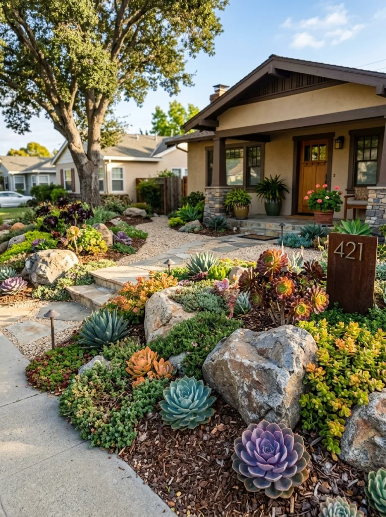 If your small front yard is on a sloped grade, replace struggling turf with a mix of creeping ground covers, agave, and colorful succulents nestled in crushed stone. Why it works: Slopes are notoriously hard to mow and water. Succulents anchor the soil naturally and actually thrive on the fast water runoff. Best home style: Southwestern, Mediterranean, or California Modern. Styling tips: Use boulders of varying sizes to create natural retaining pockets and add structural weight before planting.