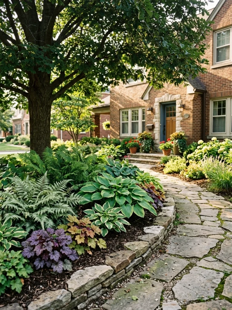 If a large existing tree completely shades your small yard, embrace it. Create a sweeping bed around the trunk using shade-loving hostas, ferns, and coral bells. Why it works: Turf grass hates deep shade. Shade perennials, however, provide lush, incredible texture with zero mowing required. Best home style: Historic homes, Wooded lots, or Traditional styles. Styling tips: Use natural stone or a clean spade-cut edge to sharply define the planted bed against whatever grass or path remains.